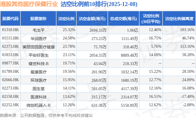 从沽空比例来看,毛戈平、华润医疗、美丽田园医疗健康沽空比例位居行业前三,分别为25.32%、24.58%、23.78%。