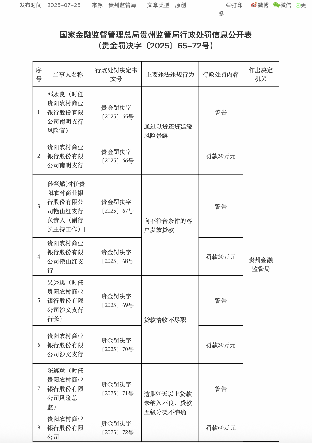 7月25日,国家金融监督管理总局贵州监管局披露的行政处罚信息公开表显示,贵阳农商行、贵阳农商行南明支行、贵阳农商行艳山红支行、贵阳农商行沙文支行分别被罚款60万元、30万元、30万元、30万元,涉及的主要违法违规行为分别为:逾期90天以上贷款未纳入不良、贷款五级分类不准确;通过以贷还贷延缓风险暴露;向不符合条件的客户发放贷款;贷款清收不尽职。