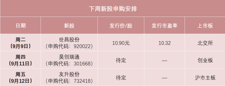日程安排上,周二(9月9日)可申购北交所新股世昌股份,周四(9月11日)可申购创业板新股昊创瑞通,周五(9月12日)可申购沪市主板新股友升股份。