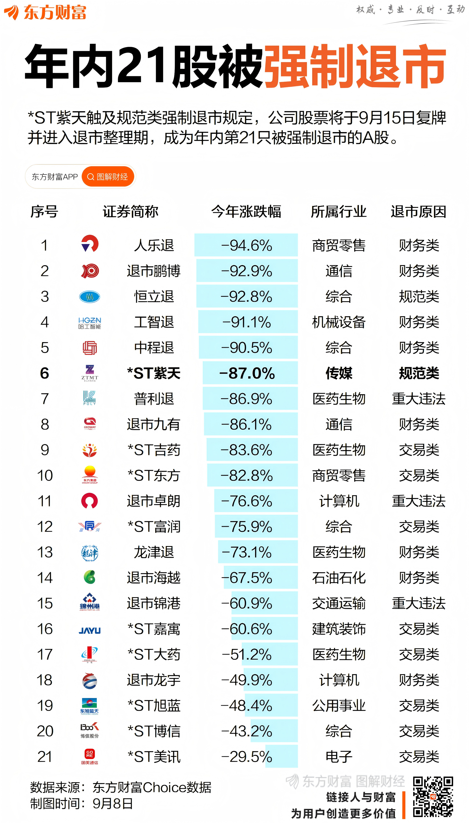 东方财富Choice数据显示,截至9月7日,今年A股已有25家上市公司退市,其中包括*ST紫天在内的21家因触及重大违法、财务类、规范类、交易类强制退市规定被强制退市,2家被吸收合并,2家主动申请退市。