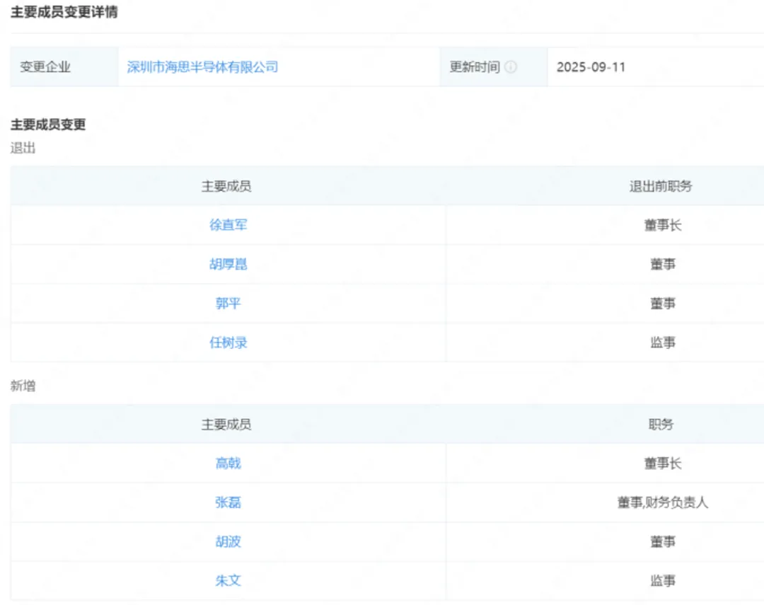 近日,深圳市海思半导体有限公司(下称“华为海思”)发生工商变更,徐直军卸任法定代表人、董事长,由高戟接任;与此同时,公司多位高管均发生变更。