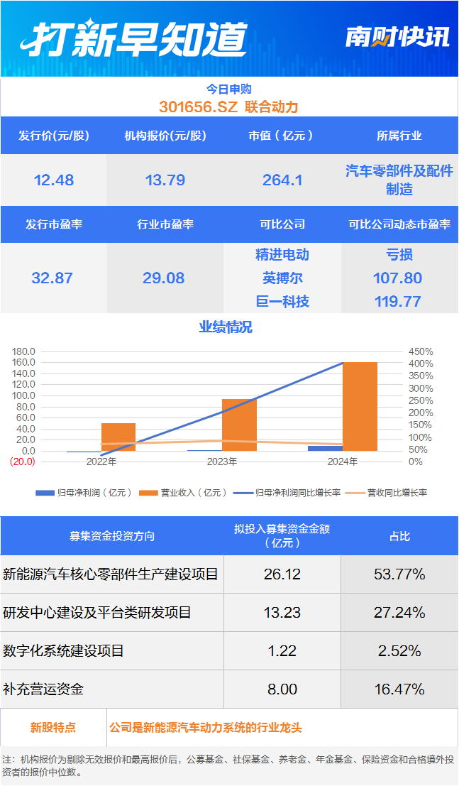9月15日,可申购创业板的联合动力(301656.SZ)。该公司成立于2016年,由A股千亿巨头汇川技术(300124.SZ)分拆新能源汽车相关业务而来,是新能源汽车动力系统提供商,主要产品包括电驱系统、电源系统等动力系统核心部件。