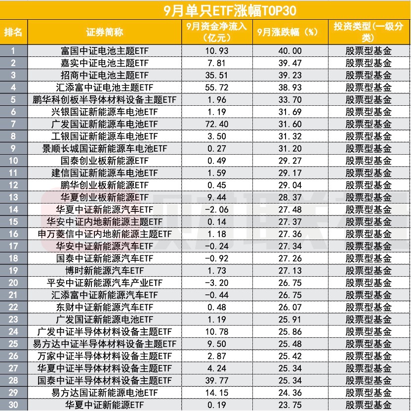 其中,富国中证电池主题ETF在9月涨幅最高,达40%,随后依次是嘉实、招商、汇添富等旗下中证电池主题ETF,鹏华科创板半导体材料设备主题ETF排名第五,9月涨幅33.7%。以电池、新能源为主的创业板与半导体材料带动下的科创板是9月市场最为吸睛的板块。