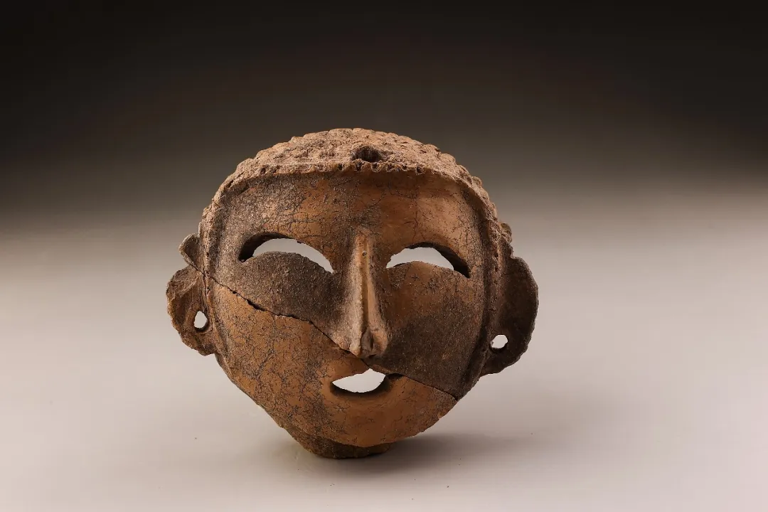 其中陶塑人面像形象生动,具有特色。其为泥质红陶,加工精致,头顶饱满,从后向前以密集戳刺纹表示头发,额顶正中有穿孔,两鬓连至下颌。面部泥条盘筑,两眼镂空月牙形;鼻梁贴塑,挺直,略呈鹰钩状;口部镂空微张,呈微笑状;双耳扁平,贴于脸颊两侧,耳垂下方有穿孔耳洞;颈部中空,半弧形。